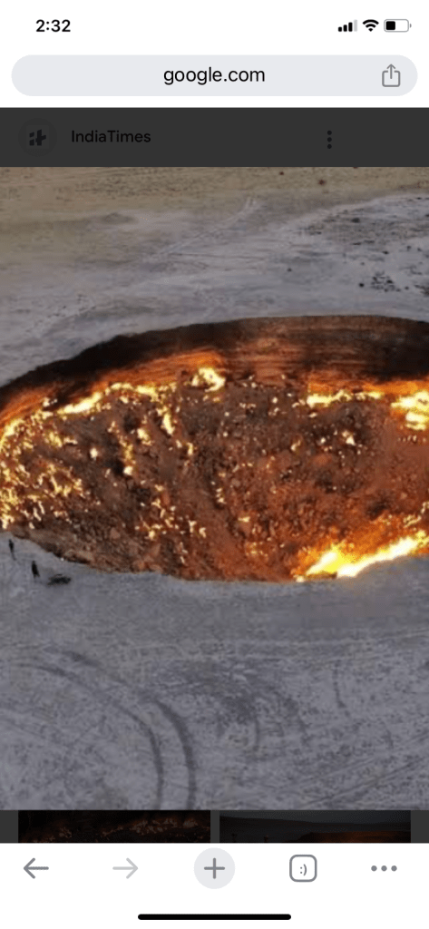 The Darvaza gas crater, also known as the Door to Hell or Gates of Hell, or, officially, the Shining of Karakum, is a burning natural gas field collapsed into a cavern near Darvaza, Turkmenistan. The floor and especially rim of the crater are illumined by hundreds of natural gas fires