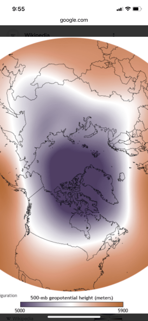 When the vortex weakens, shifts, or breaks down, the upheaval is often mirrored in the polar jet stream below. Disruptions of the vortex often lead to cold air outbreaks in the mid-latitudes. Computer models don’t agree on how global warming will affect the polar vortex
