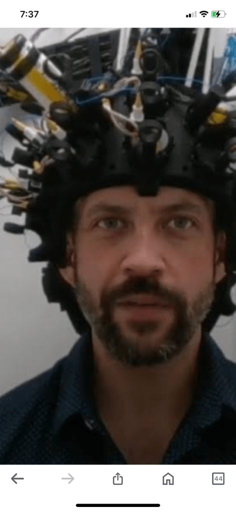 The Kernel helmet is a mobile brain scan helmet that has 52 modules for full head coverage. Each module has a laser in the center that shines through the skull and bounces off the blood flow around the brain. This detects the oxygenation levels of the blood, which reflects the activation patterns of the neurons in the brain