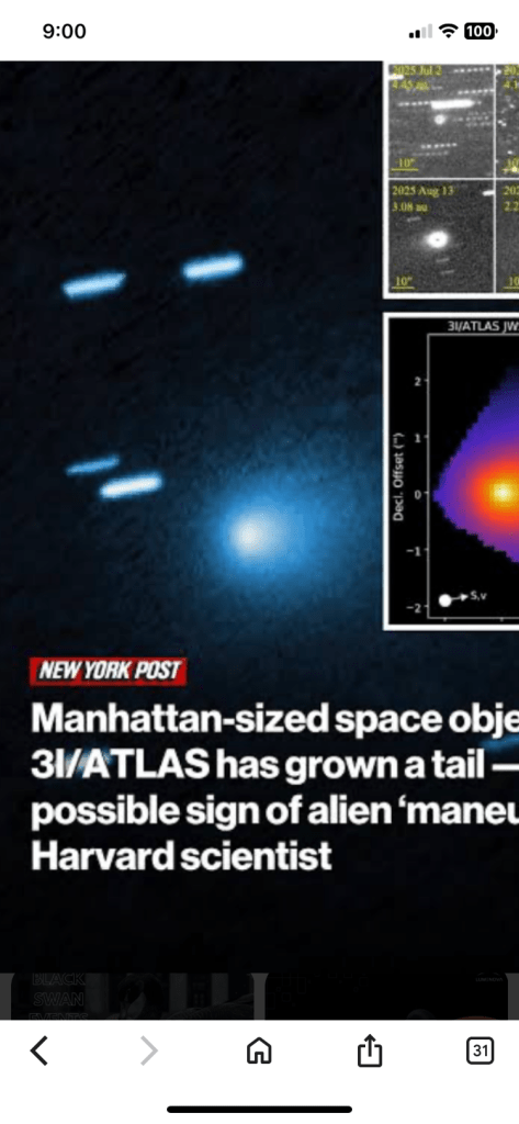 • Atypical Gassing/Jet: The object has exhibited a prominent sunward-facing jet (sometimes called an “anti-tail”) and a high concentration of nickel vapor, which is unusual for a typical comet. Loeb has suggested this could be a braking thrust or a purposeful maneuver rather than a natural outgassing.